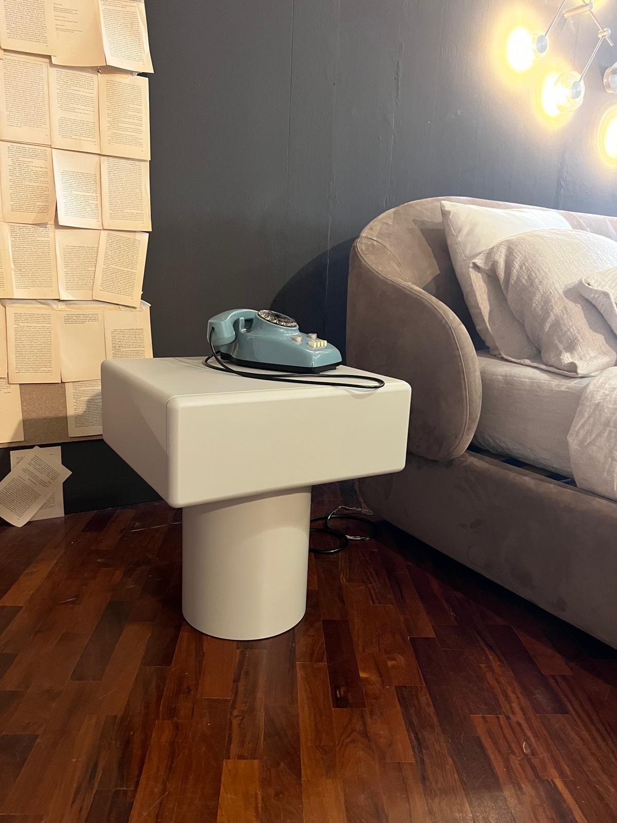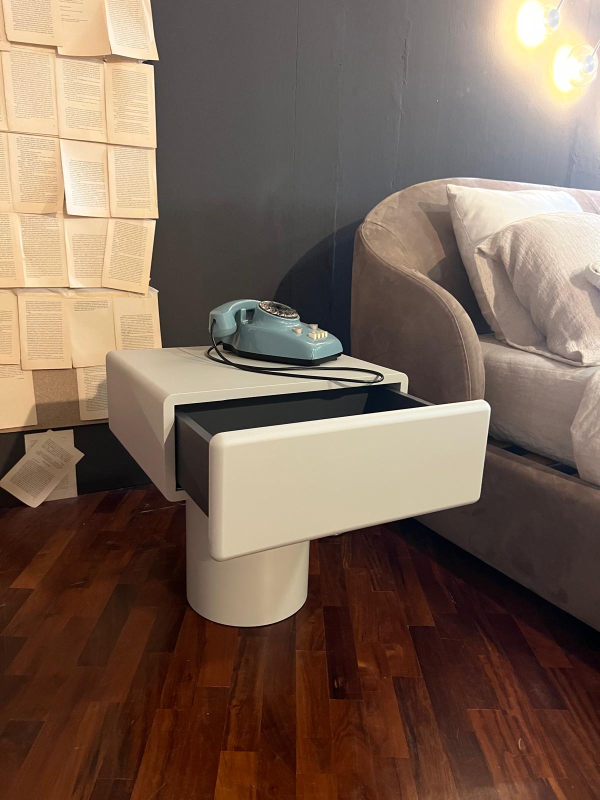 La coppia di comodini Pop rappresenta un connubio perfetto tra design essenziale e funzionalità. Questi complementi d'arredo, con la loro forma unica, arricchiscono con eleganza la zona notte. La struttura si distingue per una colonna esile ma stabile che sostiene un pratico cassetto, creando l'effetto sorprendente di un vassoio di servizio.