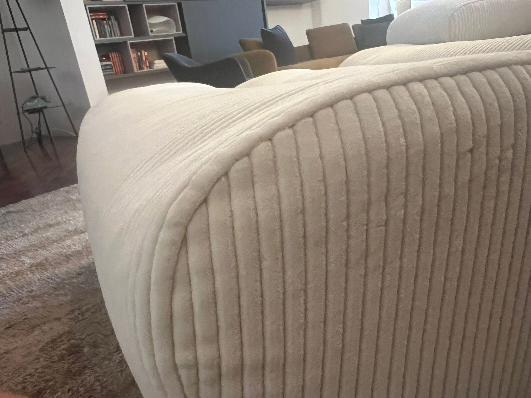 Realizzata con una struttura in legno e derivati, rivestito da poliuretano flessibile stampato monoquota con inserto in piuma, garantendo una seduta e uno schienale di eccezionale comodità. Il rivestimento in tessuto Glasgow crema aggiunge un tocco di eleganza e raffinatezza, rendendola un complemento d'arredo versatile e sofisticato.