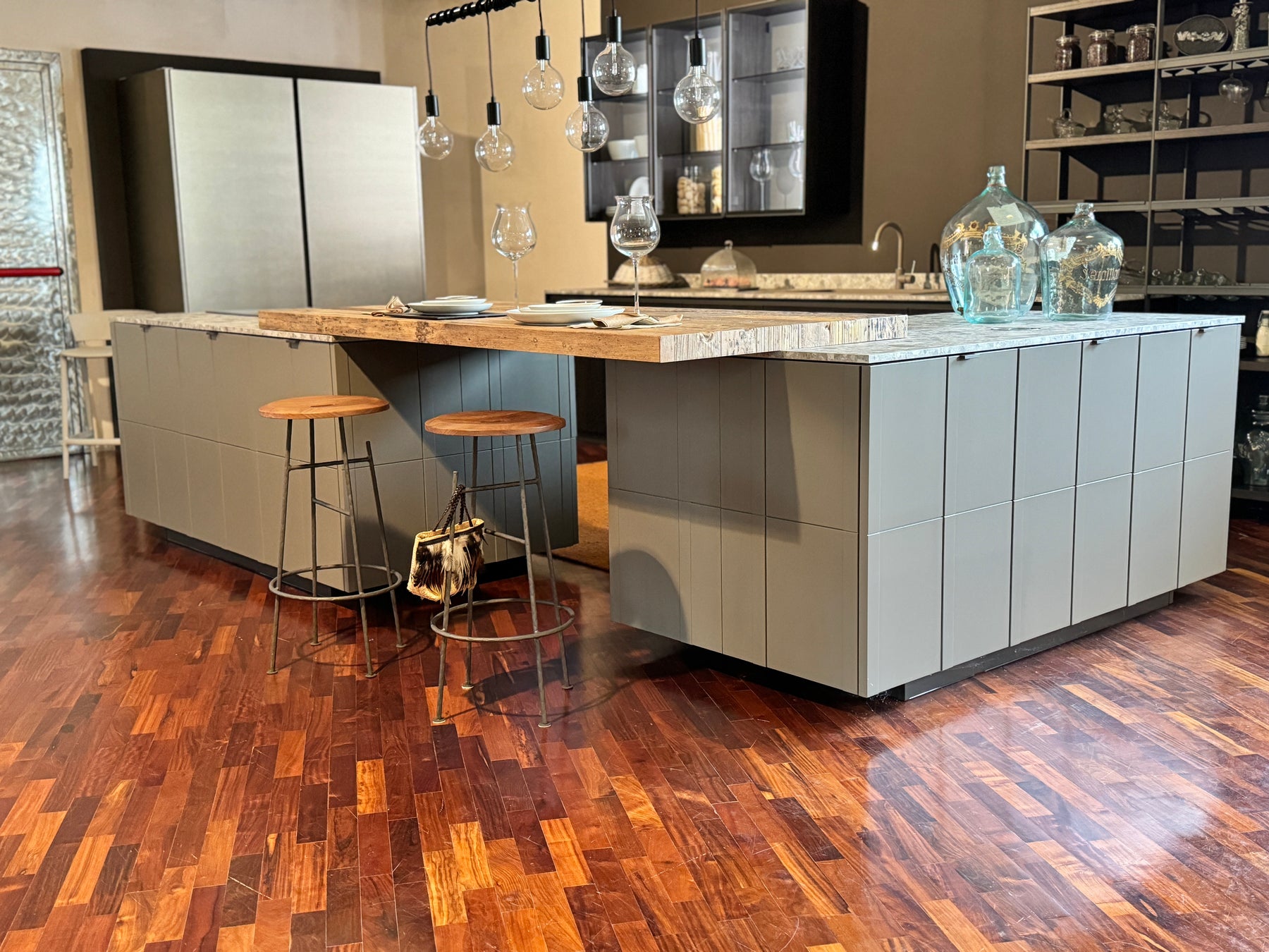 L'elemento distintivo è il piano in olmo antico, che può essere posizionato liberamente per adattarsi a qualsiasi spazio abitativo. La versatilità delle isole permette di personalizzare la disposizione secondo le esigenze specifiche della tua casa.